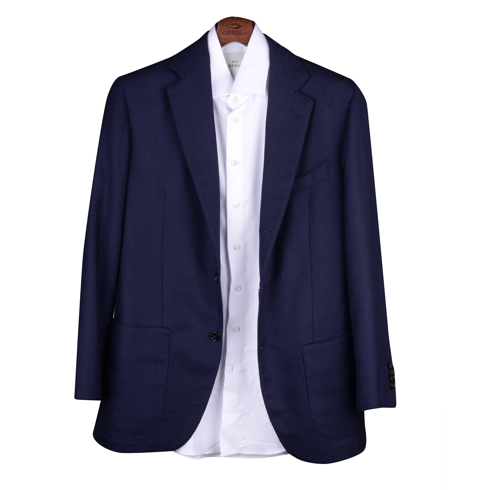 Marynarka Partigiani jest owocem naszej miłości do neapolitańskiej interpretacji krawiectwa. Krój cechuje konstrukcja half canvas - front marynarki od szwu ramiennego do środkowego guzika jest wsparty jedną warstwą lekkiego i miękkiego naturalnego płótna. Sposób w jaki są uszyte ramiona to nic innego jak "spalla camicia", brzegi ramion są subtelnie podwinięte tworząc delikatny wałeczek, pod który wszyty jest rękaw. Dodatkowe miejsce w klatce piersiowej i wysoka pacha daje niesamowity komfort i nie ogranicza ruchów, a cała marynarka nie odchodzi od karku, nawet gdy uniesiemy ręce. Brustasza to mała łódka - "barchetta", nakładane kieszenie też są uszyte po łuku i mają kształt czaszy kielicha, a ich tylna krawędź jest wyższa od przedniej. Marynarka z przodu ma trzy guziki, ale zapinamy tylko środkowy - guzik u samej góry chowa się pod zaprasowaną klapą, jest to praktycznie nieodłączny detal neapolitańskich marynarek, który głównie pełni funkcję ozdobną ciesząc nasze oko. Przód marynarki jest dłuższy od tyłu nadając odpowiedni balans całej sylwetce. Talia nie jest przesadnie wcięta, więc bez większych trudności pod marynarkę w swoim standardowym rozmiarze można zmieścić sweter.