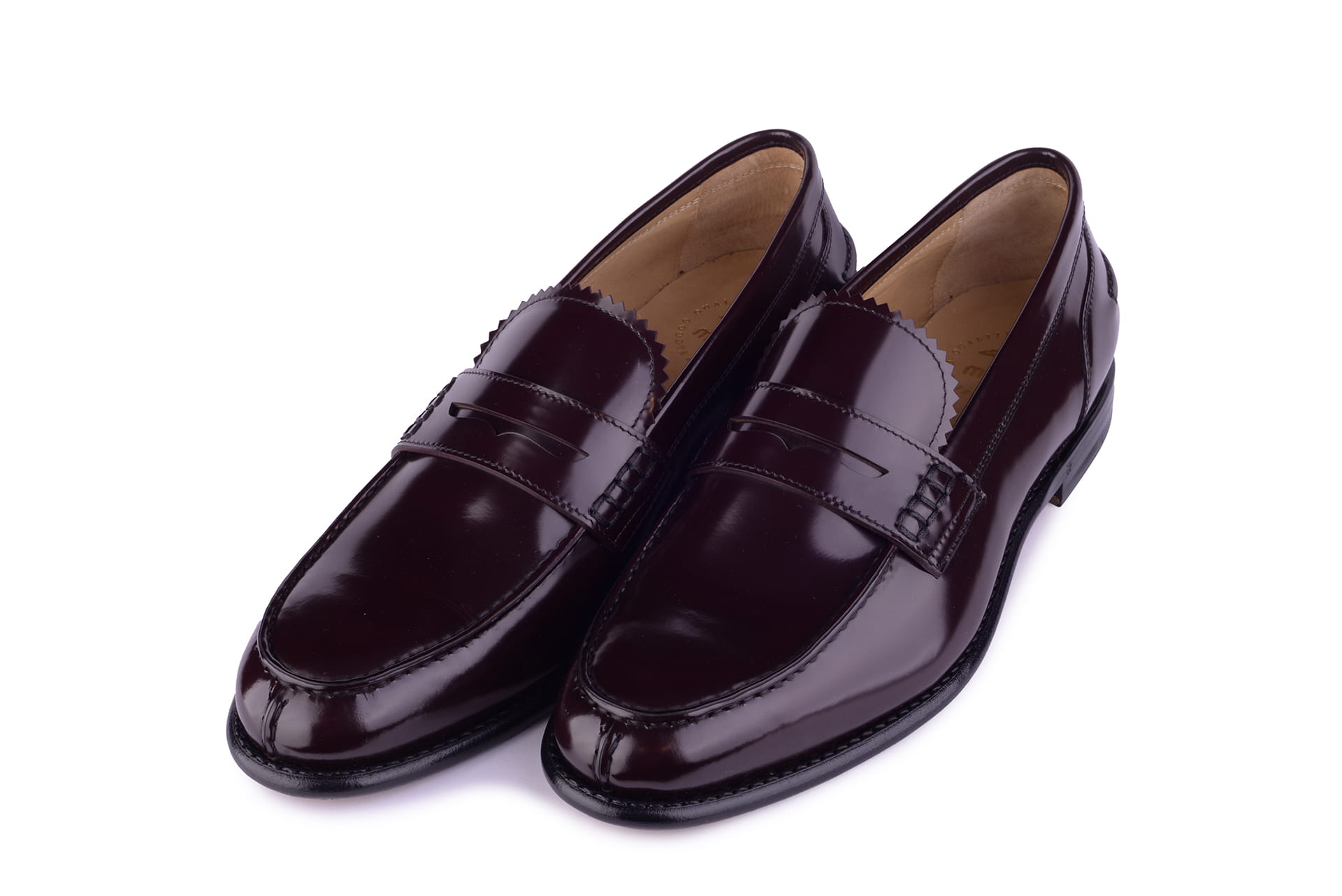 Krótki opis buta: Bordowe penny loafers na skórzanej podeszwie z wysokogatunkowej skóry bydlęcej typu Cordovan. Idealne obuwie na gorące dni lata. Dzięki precyzyjnemu szyciu metodą goodyear welted oraz zastosowaniu miękkiej cielęcej, zamszowej skóry buty szybko dopasowują się do stopy i są bardzo wygodne.