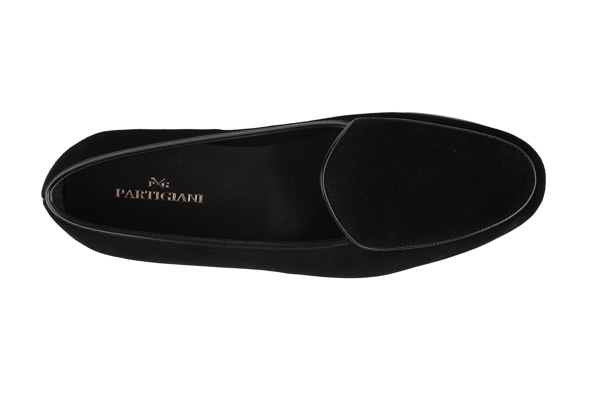 Zastosowanie: Pomimo zamszowej cholewki czarne belgian loafers są butami wsuwanymi przeznaczonymi do noszenia razem z garniturami i smokingami. Idealne obuwie ślubne w gorące dni lata.