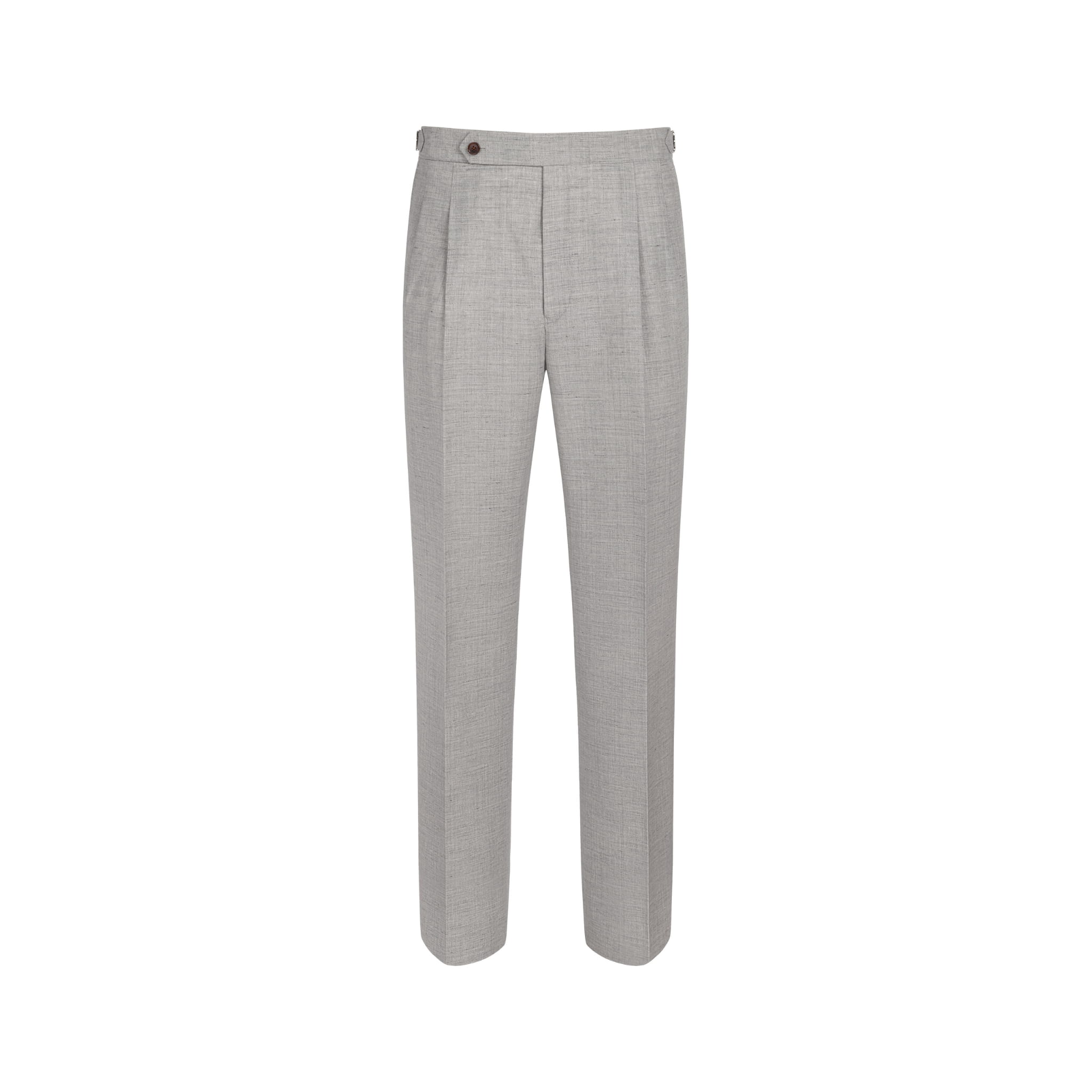 Tkanina: 52% wełna, 48% lenKolanówka: 100% wiskozaGurt wzmocniony płótnem, kurtyna, after-dinner split, guziki na szelkiSzeroki pas, przedłużone zapięcie, boczne regulatoryWysoki stan, szeroka nogawka, podwójne zakładki skierowane na zewnątrzGuziki wykonane z rogu bawolegoPoziom formalności: nieformalny/półformalnyRęcznie wykrajane, prasowane i uszyte w małej pracowni krawieckiej w Polsce